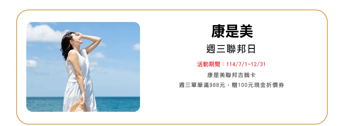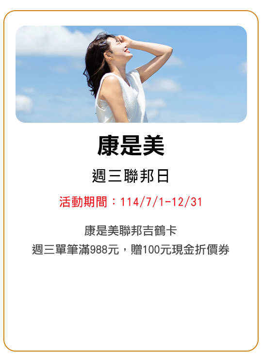 當日消費單筆滿NT$1,000現折NT$100,恕不累送,每卡每次消費最高折NT$100,同行者不得分開結帳。 |