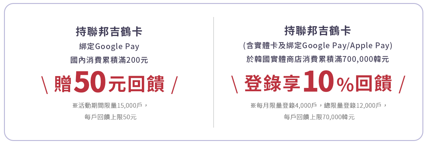 | 【登錄加碼1.5%】 活動期間115/1/1-115/6/30,自完成登錄起活動期間於日本實體商店(不含網路交易、交通類交易)使用聯邦吉鶴卡綁定Google Pay/Apple Pay單筆感應支付換算台幣100元含以上,享活動加碼1.5%回饋(每月歸戶回饋上限600元)。登錄名額不限,活動期間僅須登錄乙次即享活動資格,無須重複登錄;恕無法往前溯及尚未登錄之月份。 例一:客戶於4/15登錄成功,115/4/1~115/4/30於日本實體商店使用聯邦吉鶴卡綁定Google Pay/Apple Pay單筆感應支付換算台幣50,000元,享活動加碼1.5%回饋,回饋金為600元。 例二:客戶於5/20登錄成功,115/4/1~115/4/30於日本實體商店使用聯邦吉鶴卡綁定Google Pay/Apple Pay單筆感應支付換算台幣50,000元,恕不符合活動回饋資格。 |