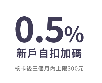 | 1. | 新戶綁定聯邦帳戶(含實體帳戶、NewNewBank數位帳戶)自動扣繳信用卡款享國內新增一般消費加碼0.5%(核卡後三個月內上限300元),如活動期間終止自動扣繳,恕不符合加碼回饋資格。 |