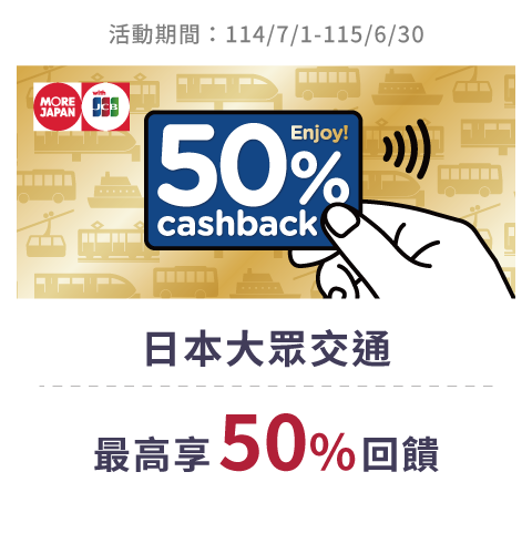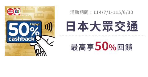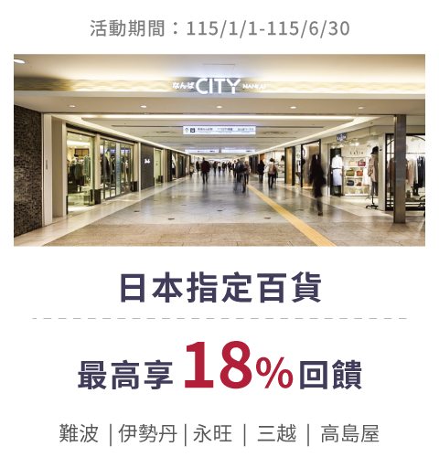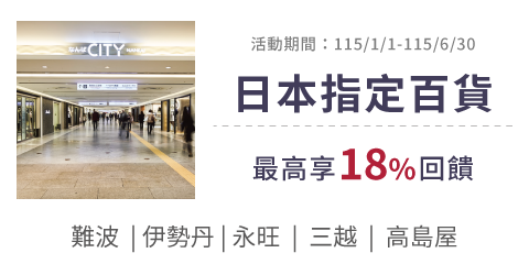 | 1. | 活動期間115/1/1-115/6/30,新戶於活動期間申辦且核卡,並於日本實體商店交易,享新戶活動加碼3%回饋(活動期間歸戶回饋上限600元)。 |