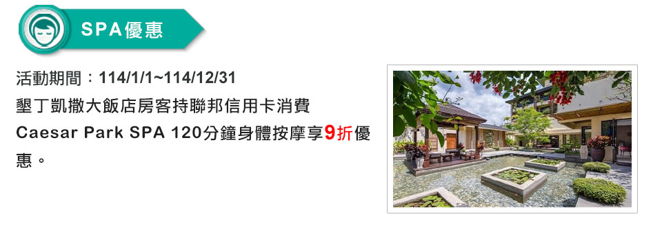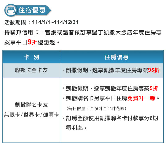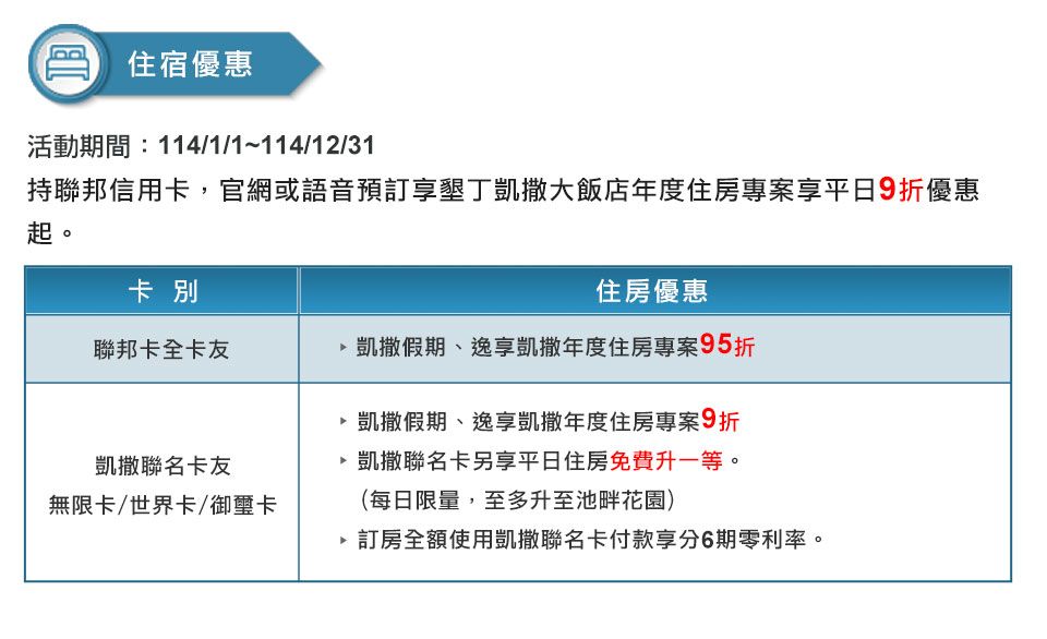 上述優惠恕不得與其他促銷優惠/各式票券/旅遊補助/團體旅遊併用;若有其他未盡事宜以墾丁凱撒大飯店規定為準,聯邦銀行及墾丁凱撒大飯店保留活動修正之權利。 |