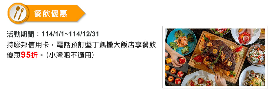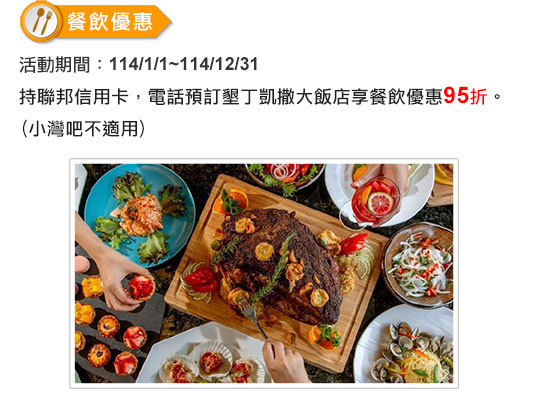 餐飲優惠不適用於桌菜、婚宴及特殊節慶餐飲、酒類、外帶及宅配等消費。 |