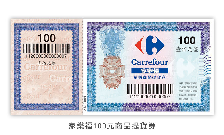 | 滿8,000元 | 家樂福100元商品提貨券 | 100份/日 |