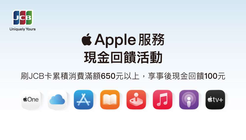 於活動期間刷聯邦JCB卡購買指定Apple Services,累計消費滿額650元以上,可享 100元事後現金回饋。