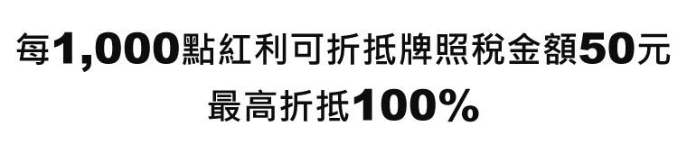 抵扣方式採全點數折抵,每1,000點紅利折抵50元,不足1,000點則不予折抵,最高折抵牌照稅金額100%,抵扣點數以系統作業當下計算之紅利點數為準,本活動紅利點數一經折抵,即不得要求更改、取消及退還。