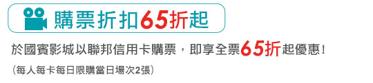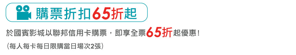 | 2. | 『聯邦信用卡天天65折起』活動,每人每卡每日限購當日場次2張,以實體聯邦信用刷卡購票,需出示購票當月或上個月單筆499元以上之同卡號實體信用卡簽單正本方可享有折扣(以信用卡繳費之明細、電子簽單等單據恕無法適用),實體簽單正本需於現場供服務人員加蓋『已兌換』戳記後返還,該簽單即無法重複使用電影優惠。 |