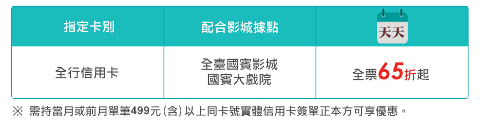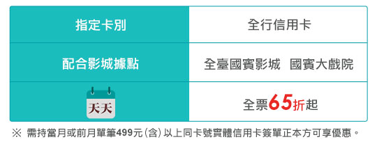 | 1. | 『聯邦信用卡天天65折起』活動僅適用於一般影廳之全票,尊爵席、D-BOX座椅及金鑽貴賓廳不適用,活動僅限以聯邦銀行信用卡於全臺國賓影城刷卡購買當日場次方可享有對應優惠。 |