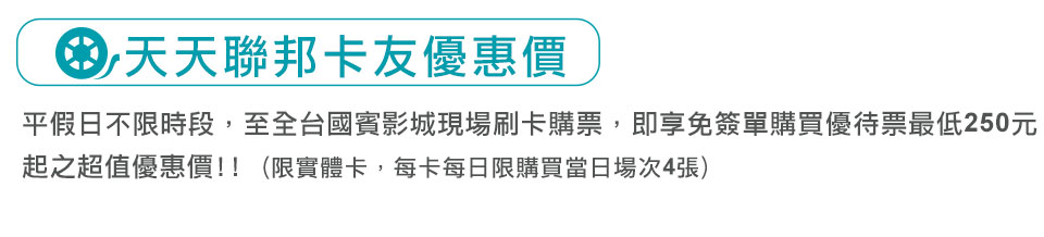 | 3. | 『天天聯邦卡友優惠價』活動,係指以實體聯邦信用卡直接於國賓影城各據點刷卡購買當日電影票(無需簽單),即可享各影城據點之優待票價,每卡每日限購當日場次4張;實際票價依照國賓影城各據點、影廳相異而有不同票價,詳細票價依國賓影城官網公告為準。 |