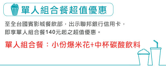| 8. | 『單人超值組合餐』優惠,於國賓影城餐飲部出示任一聯邦銀行信用卡,即享超值套餐優惠,不可變更品項組合與內容,每人每卡不限購買數量。 |